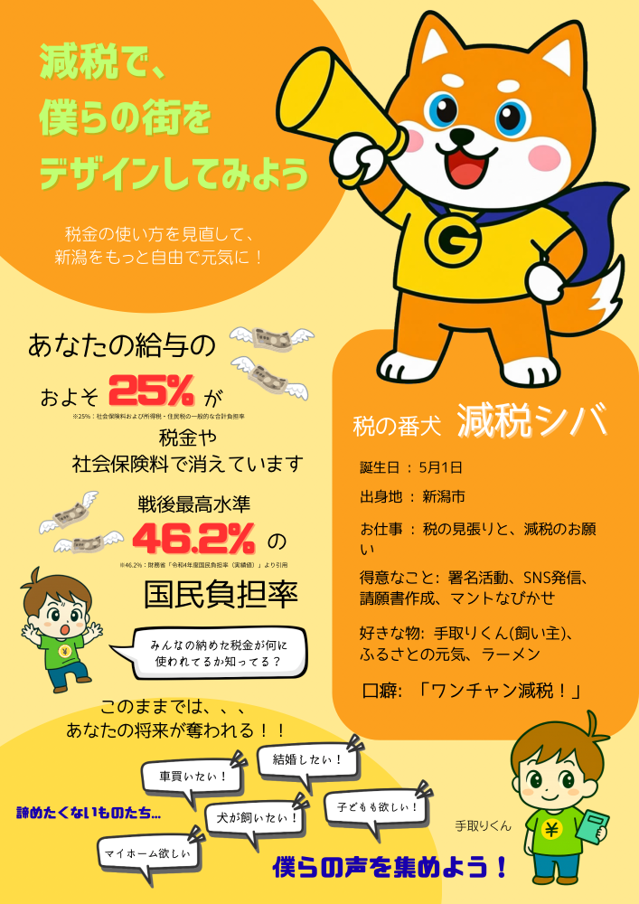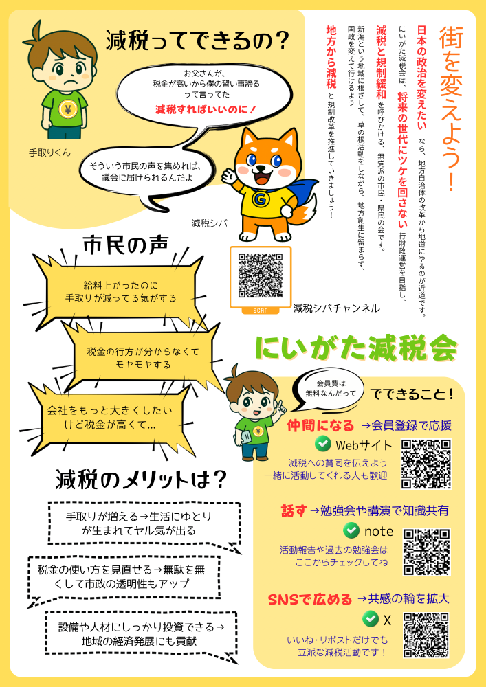 にいがた減税会は、将来の世代にツケを回さない行財政運営を目指し、減税と規制緩和を呼びかける、無党派層の市民・県民の会です。